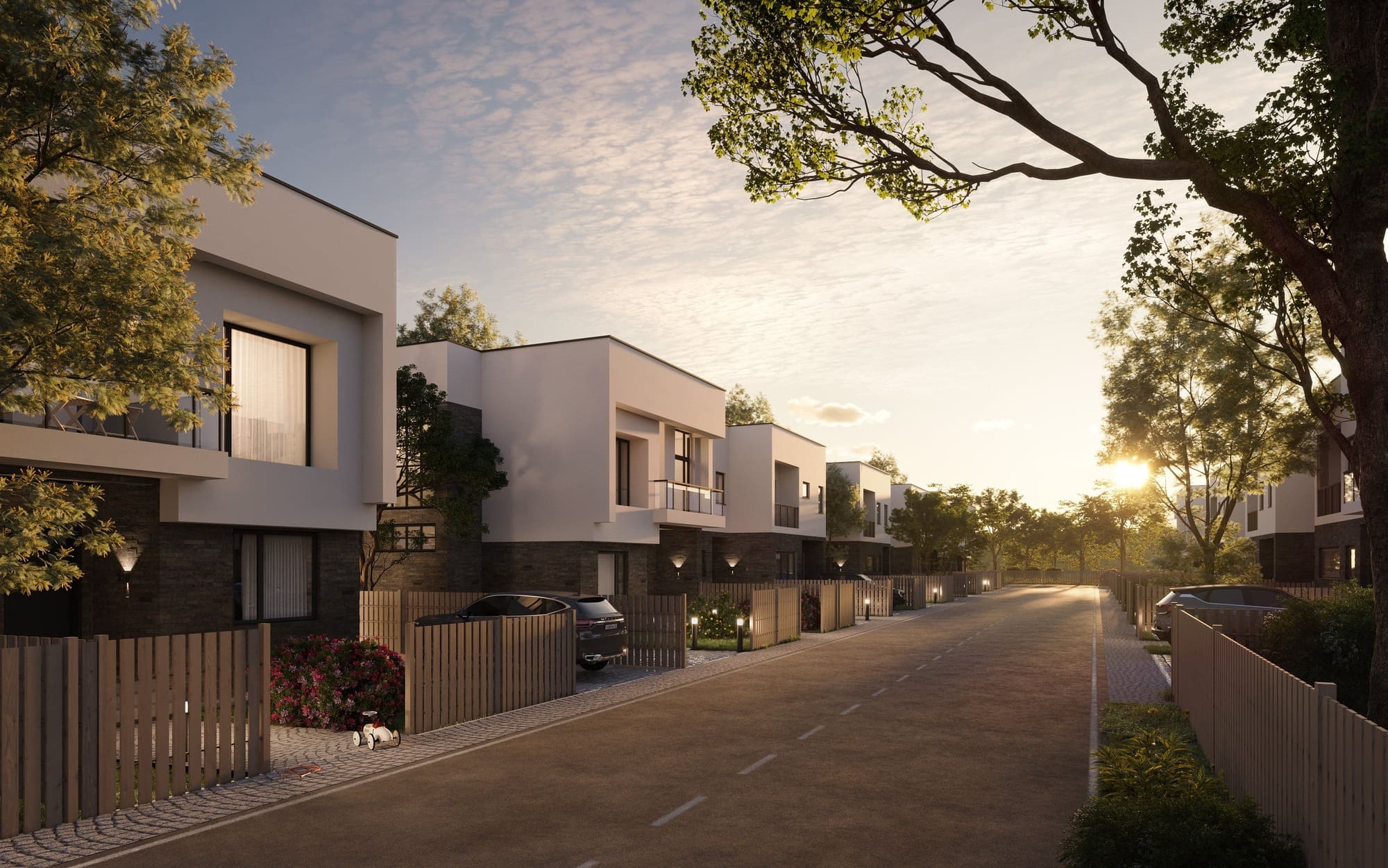 Strada va fi pavata cu pavele, la fiecare locuinta este loc de parcare pentru 2 masini.